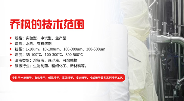 上海喬楓實業有限公司,成立于2012年,是從事噴霧干燥設備的研發設計、生產、銷售(小型噴霧干燥機實驗型噴霧干燥機,35℃低溫噴霧干燥機,有機溶劑噴霧干燥機,低溫閉式循環噴霧干燥機、超細粉末噴霧干燥機噴霧冷凍干燥機、真空噴霧干燥機、氣流噴霧干燥機,噴霧造粒干燥機,離心噴霧干燥機,沸騰制粒機等)和售后于一體的綜合性公司,本公司現成為一家致力于為生物制藥、精細化工、新能源、陶瓷造粒及食品工程等領域提供全套解決方案的整線交鑰匙工程企業。